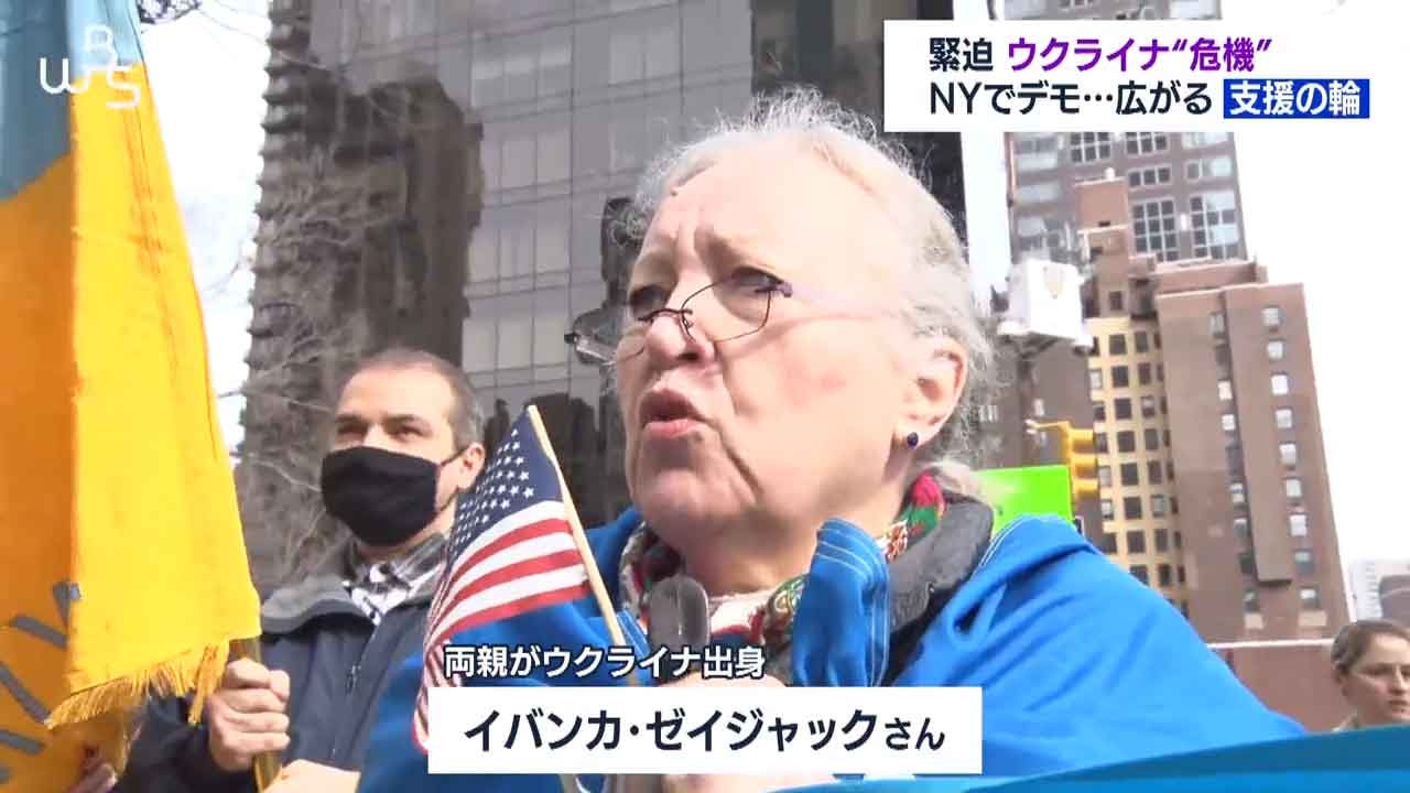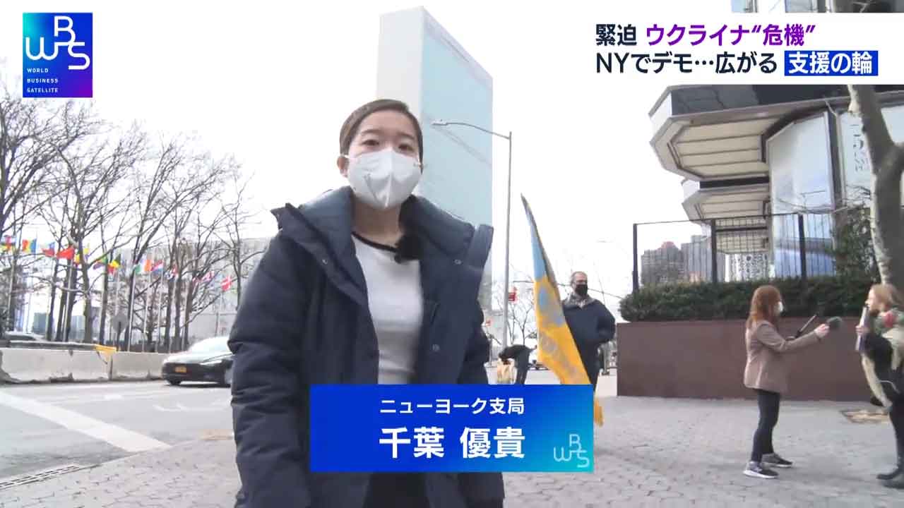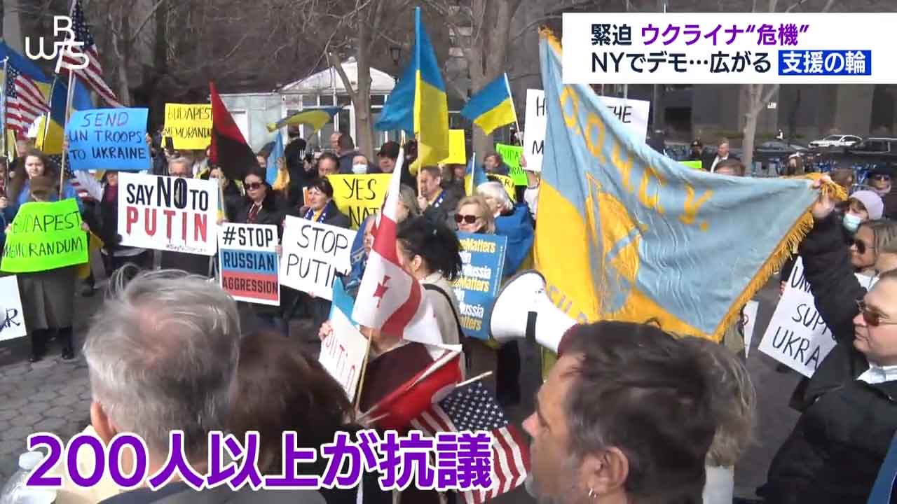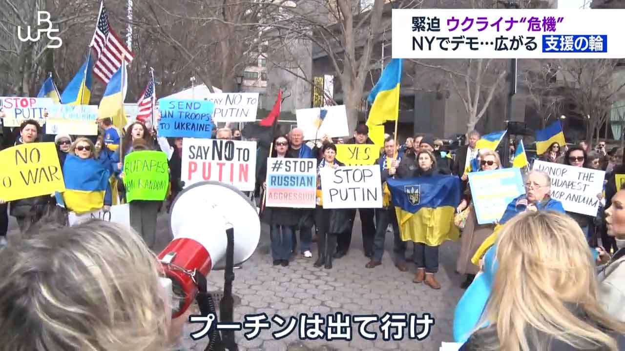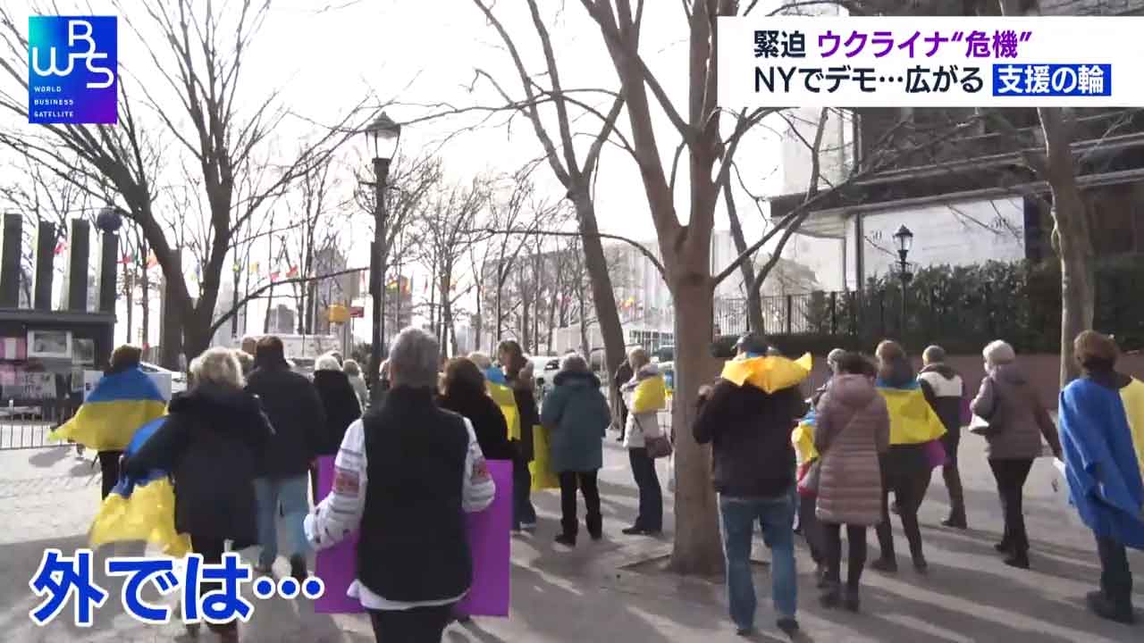 ニューヨークの国連本部前です。ロシアによるウクライナ進行を止めようと抗議集会が開かれています。