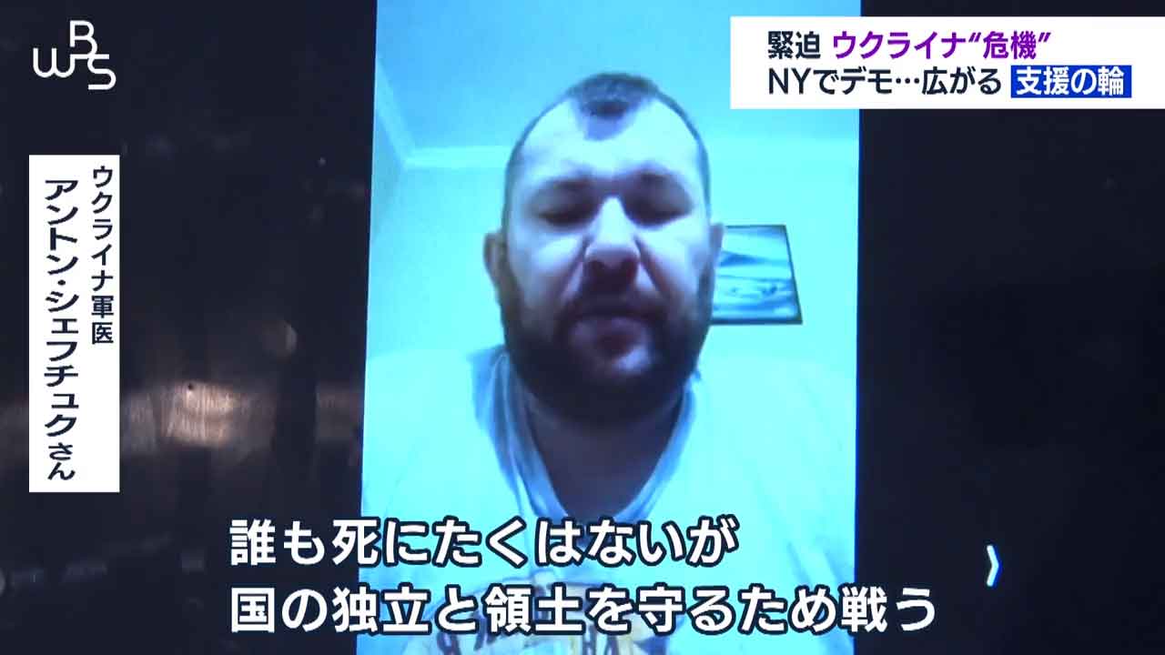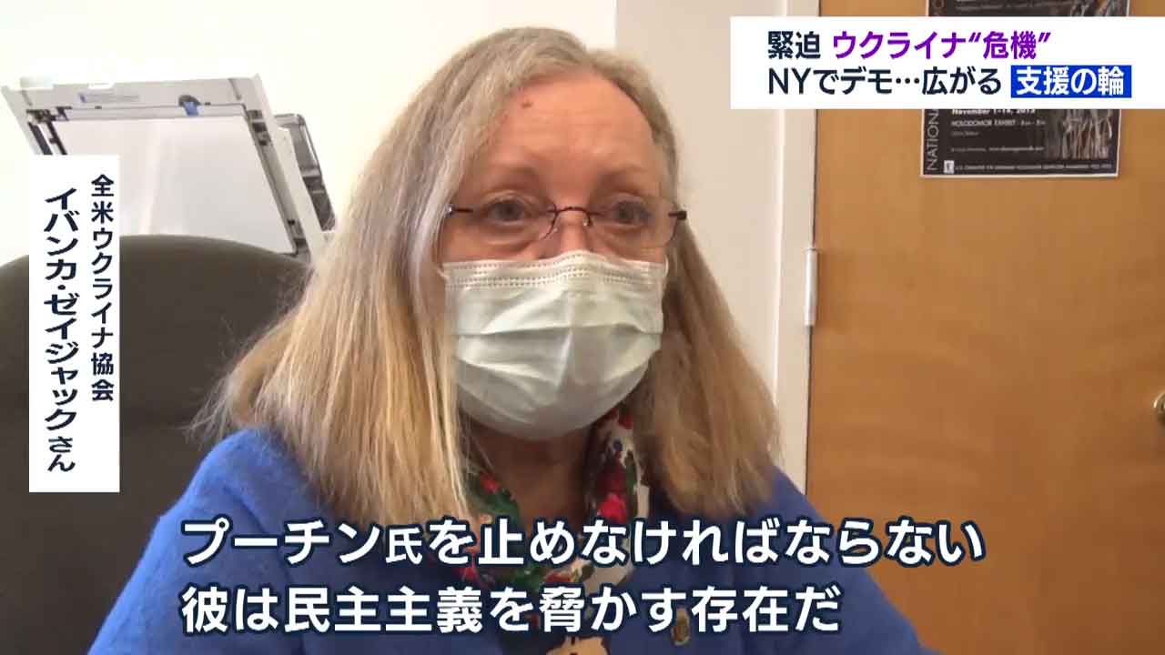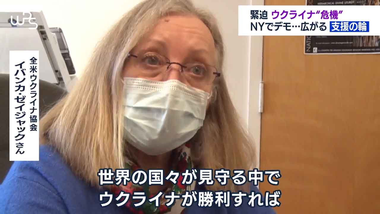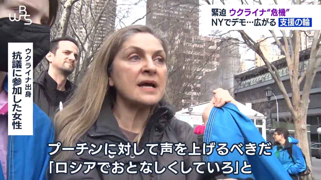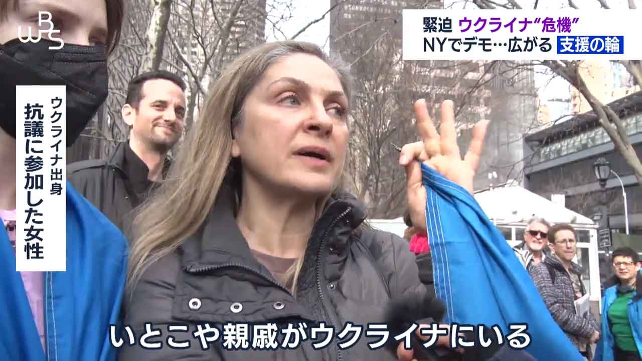 ニューヨークの国連本部前です。ロシアによるウクライナ進行を止めようと抗議集会が開かれています。