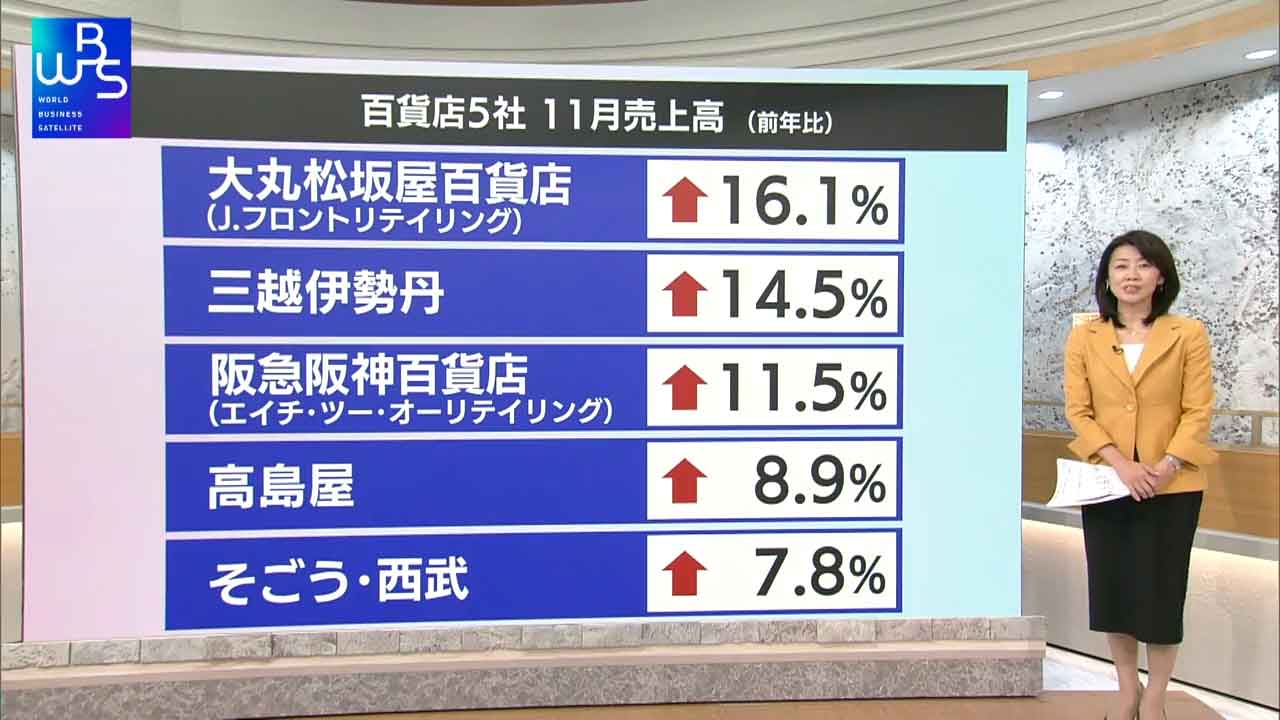全社そろって1年前の実績を上回り、そのうち3社、大丸松坂屋百貨店、三越伊勢丹、そして阪急阪神百貨店などは二桁のプラス、回復基調となっています。
