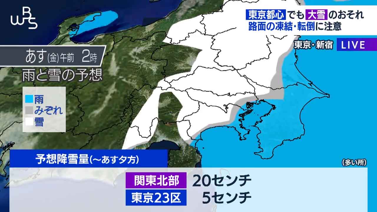 関東甲信では2月11日の明け方にかけて雪の強まるところがある見込みで、2月11日の夕方までに降る雪の量は多いところ、関東北部で20センチ、東京23区でも5センチと予想されています。
