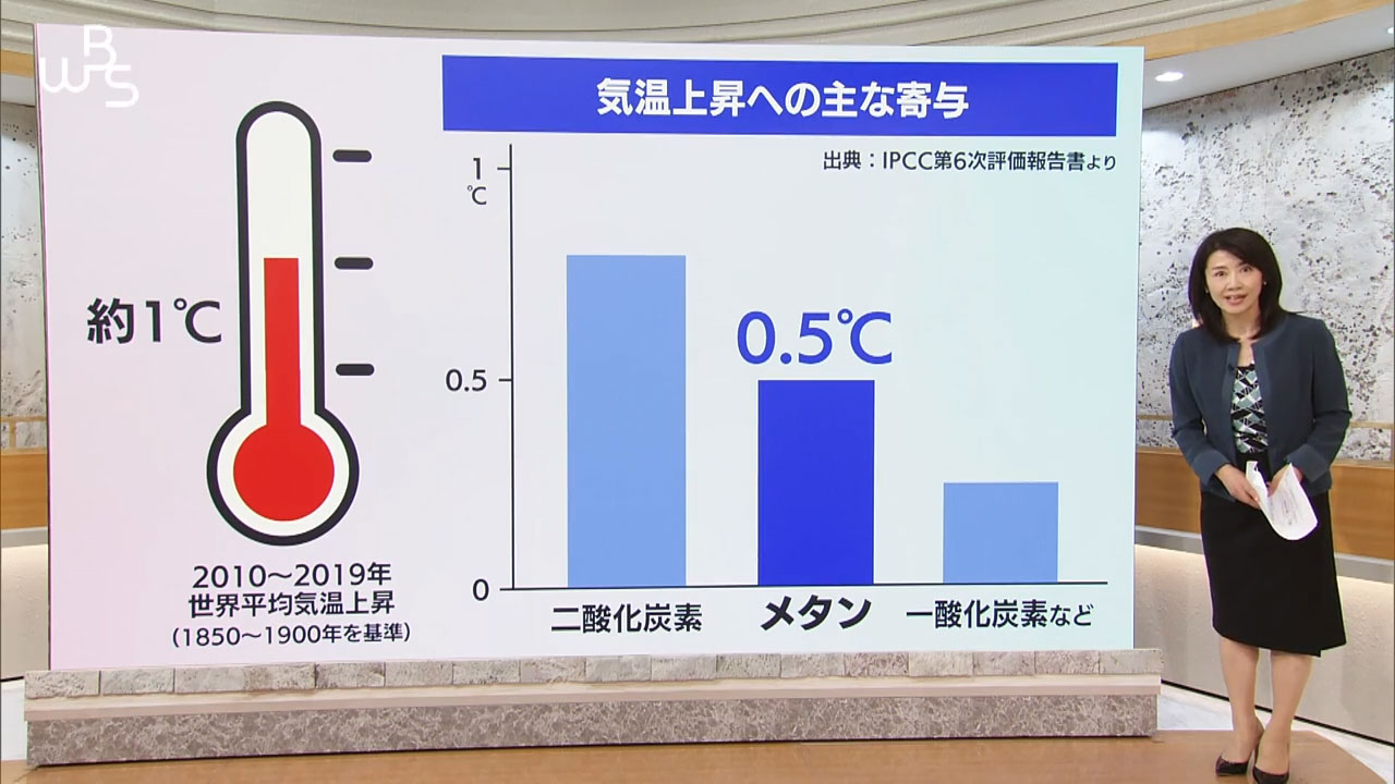 その要因となっているのが一番が二酸化炭素、その次がメタンです。メタンは平均気温を0.5度上昇させたとされています。