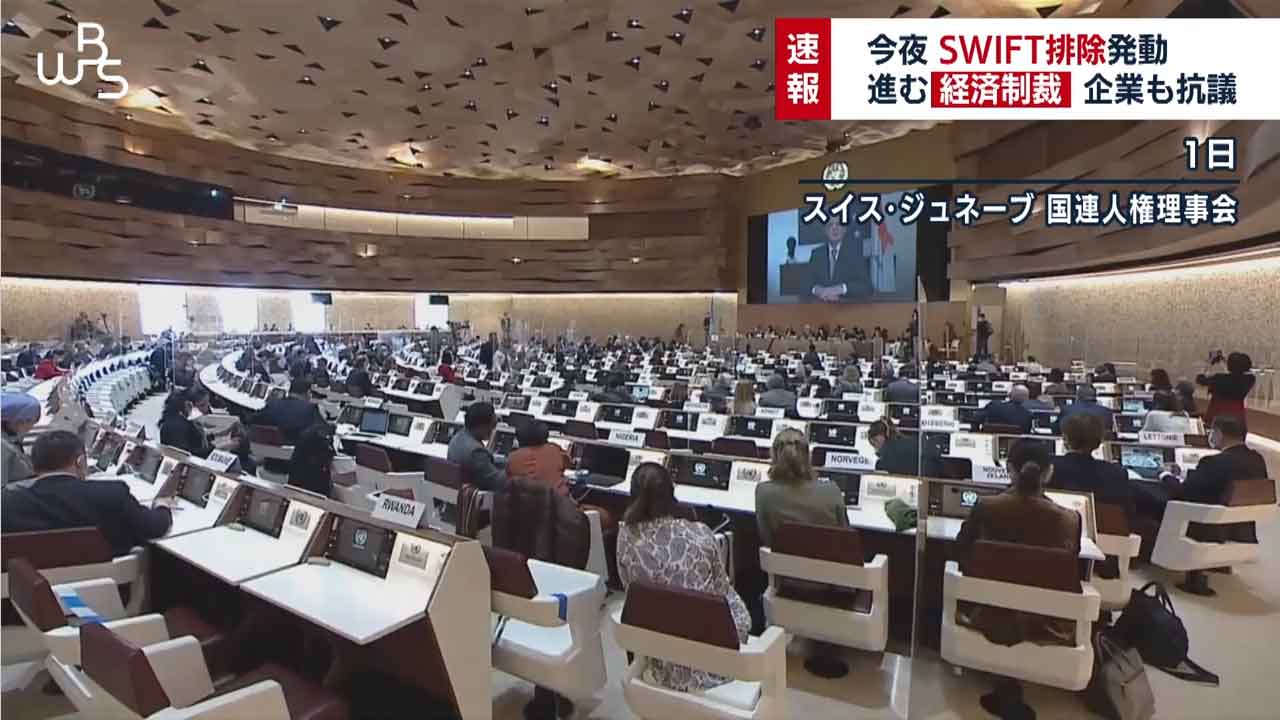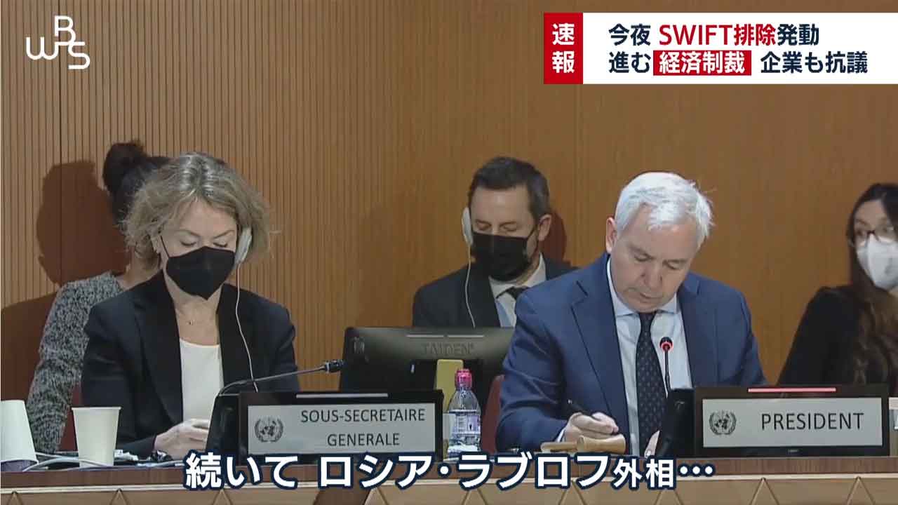 ロシアの外相によるビデオ演説を前におよそ40ヵ国の外交官が立ち上がり一斉に退場。侵攻を正当化するロシアに抗議の意思を示しました。