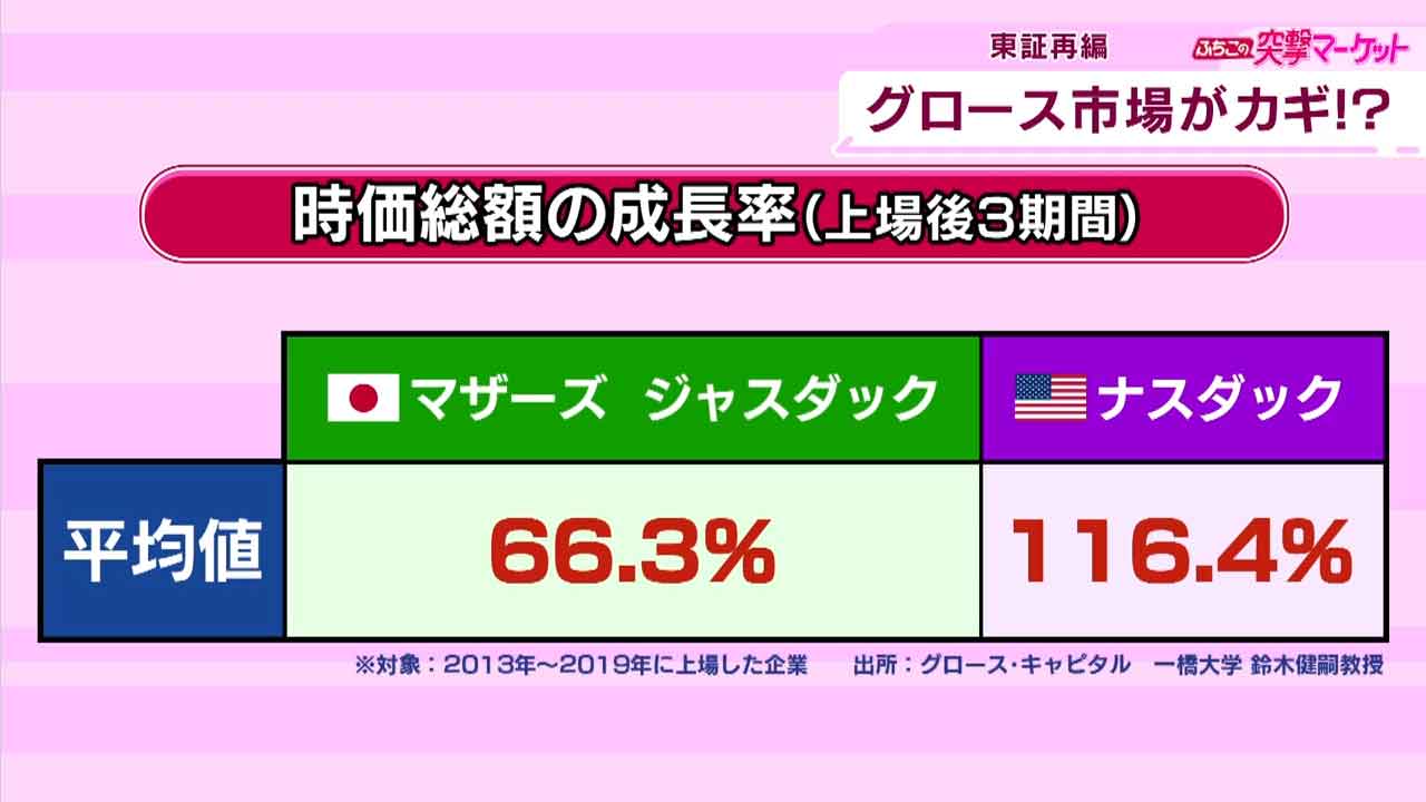 2013年から2019年に新興市場に上場した企業についてIPO直後の決算期末と3期後時点の時価総額を比較すると平均成長率はおよそ66%、アメリカのナスダックはおよそ116%と差があります。